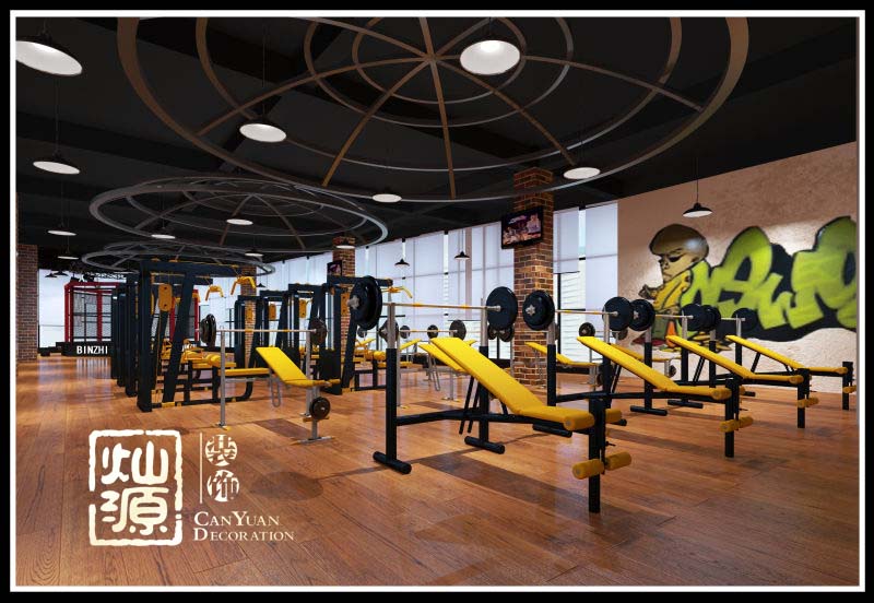 大廳區(qū)域:黑色吊頂加上圓形的木制造型,黃色動感的運動器械,質(zhì)樸的材質(zhì),穩(wěn)重的色彩營造出一個愉悅的室內(nèi)空間,讓熱愛運動的健身者可以在這里徹底放松身心。