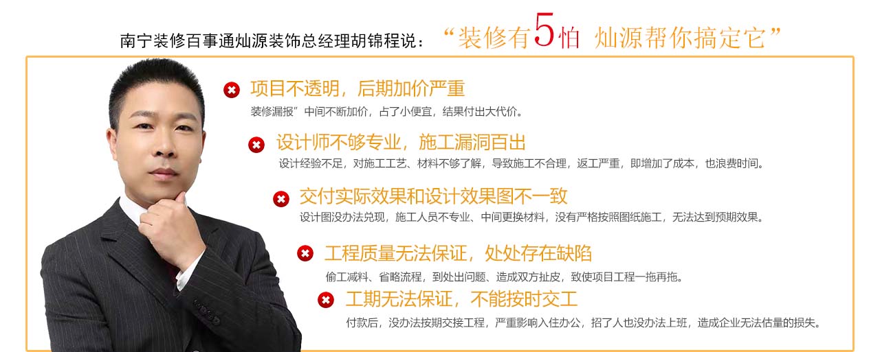 燦源裝飾是一家擁有國(guó)家裝飾裝修二級(jí)資質(zhì)和11年室內(nèi)裝飾工程設(shè)計(jì)、施工經(jīng)驗(yàn)的南寧裝修公司。公司一直致力于打造高品位的辦公室裝修設(shè)計(jì)、商業(yè)空間,為客戶提供方便快捷的一站式服務(wù)。公司倡導(dǎo)透明化裝修,擁有O2O工程監(jiān)控系統(tǒng),實(shí)現(xiàn)工地全天候視頻直播體系,我們敢于將裝修主動(dòng)權(quán)交還到業(yè)主手中,讓業(yè)主實(shí)時(shí)掌握工地信息,做質(zhì)量可靠的放心工程。 燦源裝飾的宗旨...